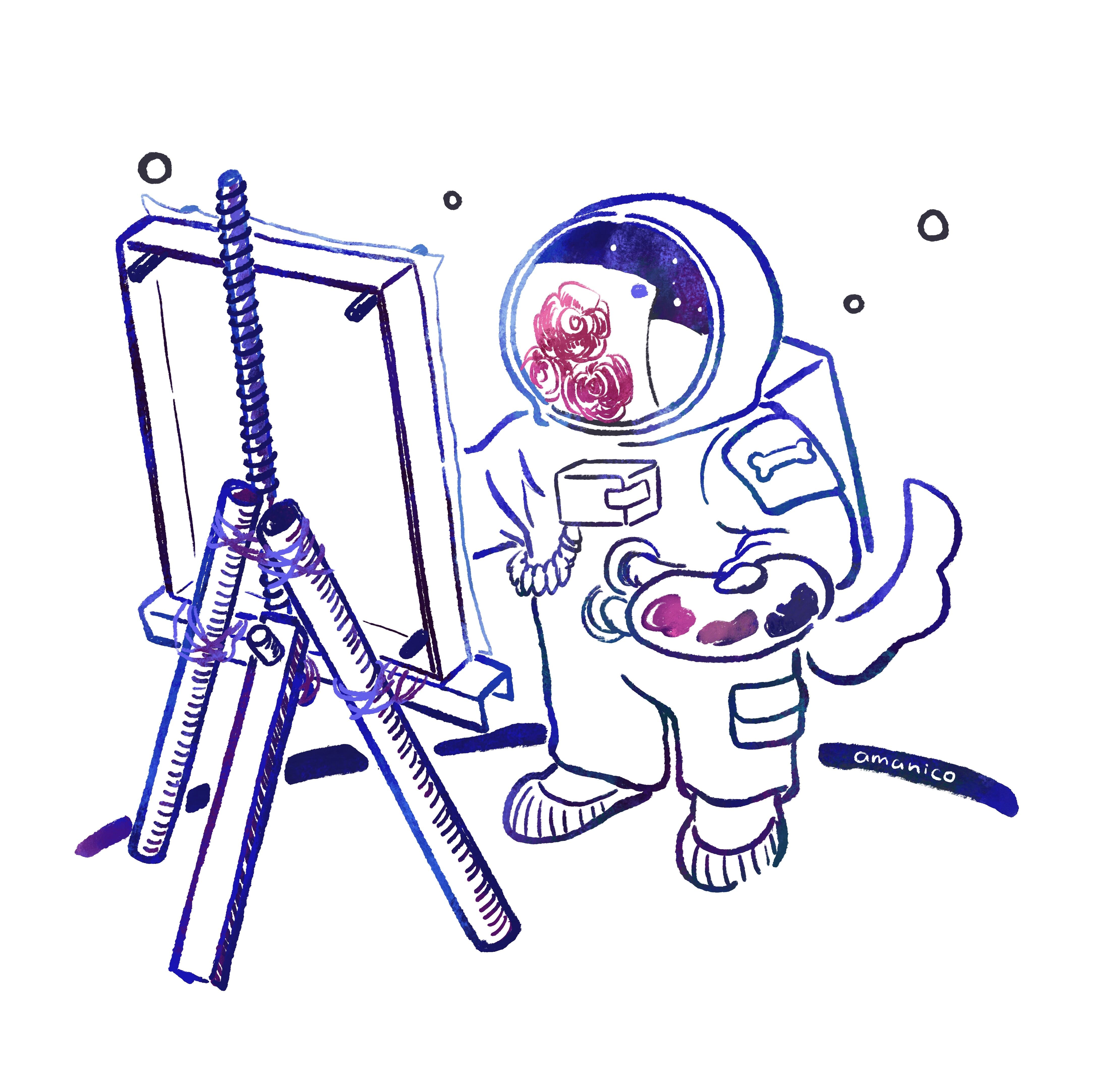 空色絵の具と鉄屑で絵を描いている犬がいました。
