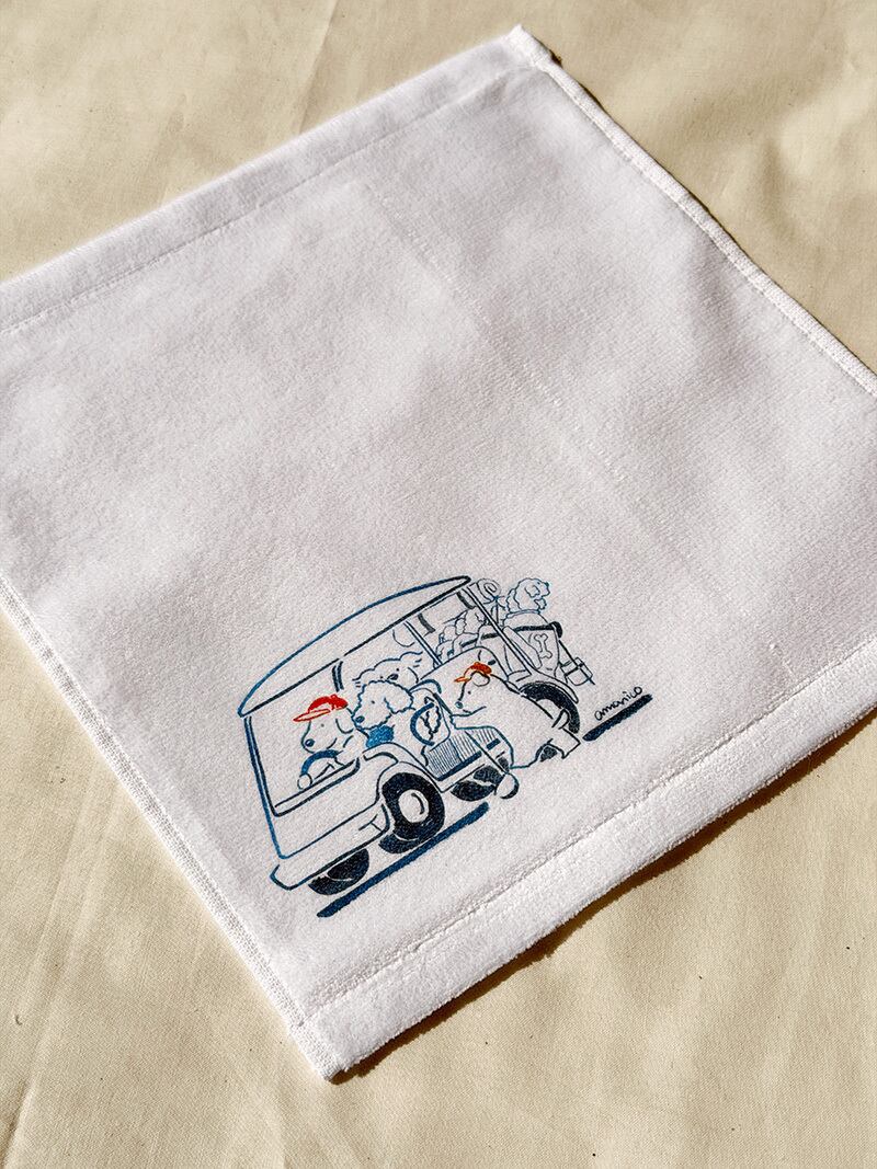 綿100%のハンカチです。白い生地にイラストがプリントされているシンプルなデザインなので、さまざまなシーンでお使いいただけます。