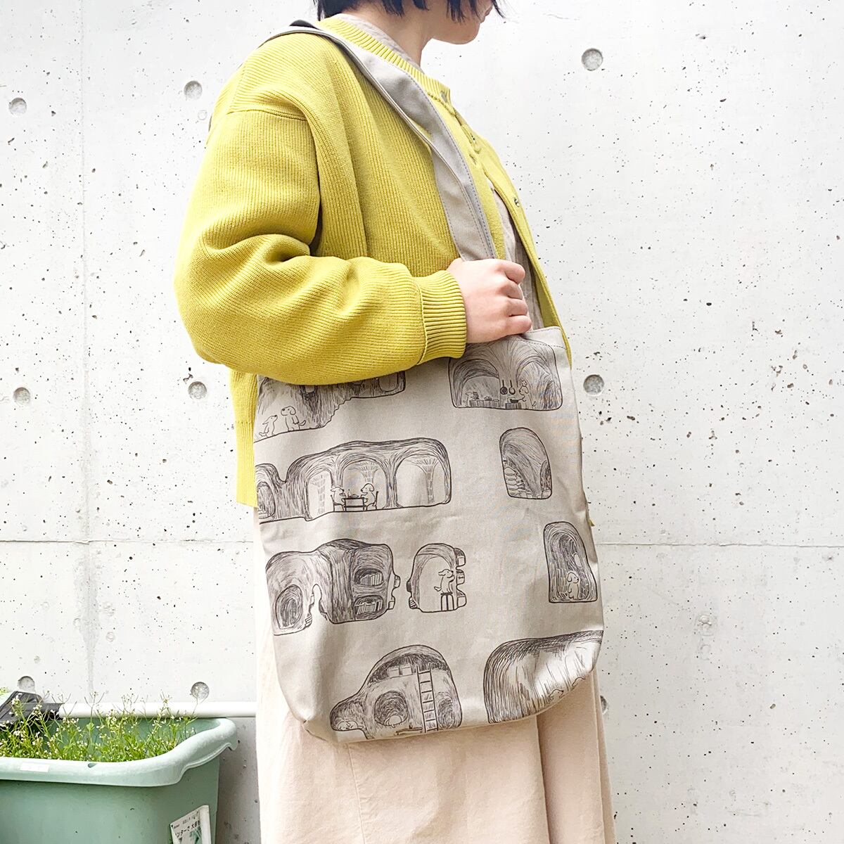 シックな色味の生地と、地下都市を冒険する犬たちのイラストが特徴のトートバッグです。コーデのアクセントにいかがでしょうか。